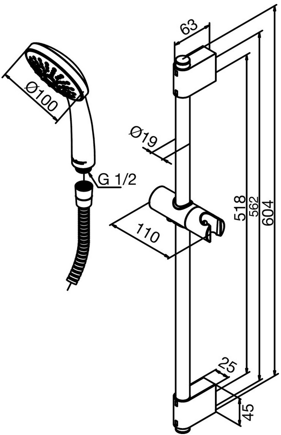 Brusesæt indeholder stang, glider(holder), håndbruser og 1500 mm plast slange.