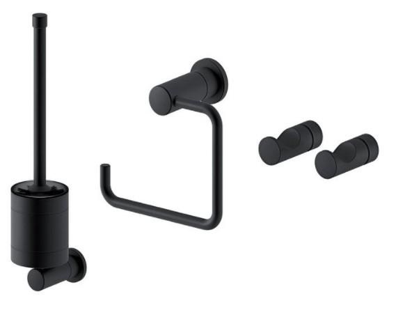 Du får en flot strømlinet, væghængt toiletbørste med udskifteligt hoved, enkel toiletpapirholder og 2 håndklædekroge.