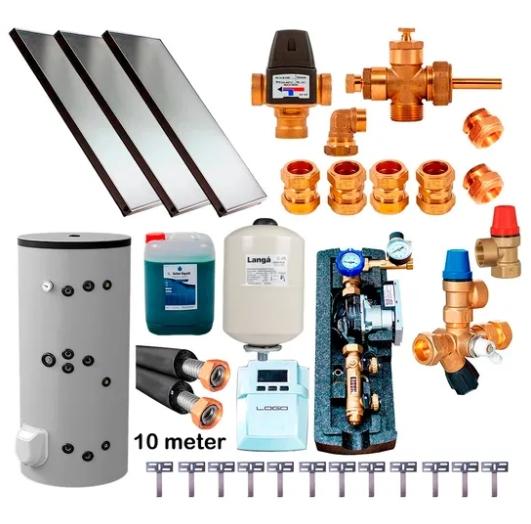 Pakke med alle nødvendige dele til et solvarmeanlæg. Skal blot samles og monteres.