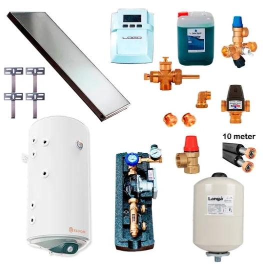 Pakke med alle nødvendige dele til et solvarmeanlæg. Skal blot samles og monteres.