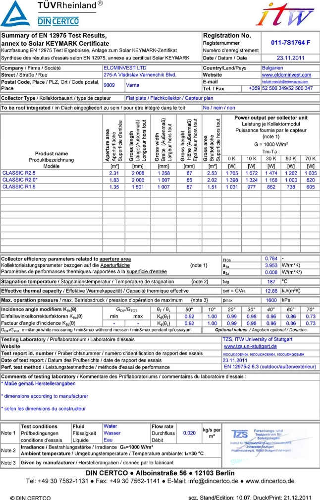 Classic panelerne er godkendte af det tyske prøvningsinstitut Solar KEYMARK. De er en af de førende instituter inden for solvarme og deres certifikat garanterer at solvarmepanelet er af den højeste kvalitet.