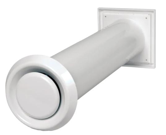 Komplet ventil med murgennemføring og insektnet. Udvendig hvid jalousirist, indvendig hvid ventil. 480 mm.