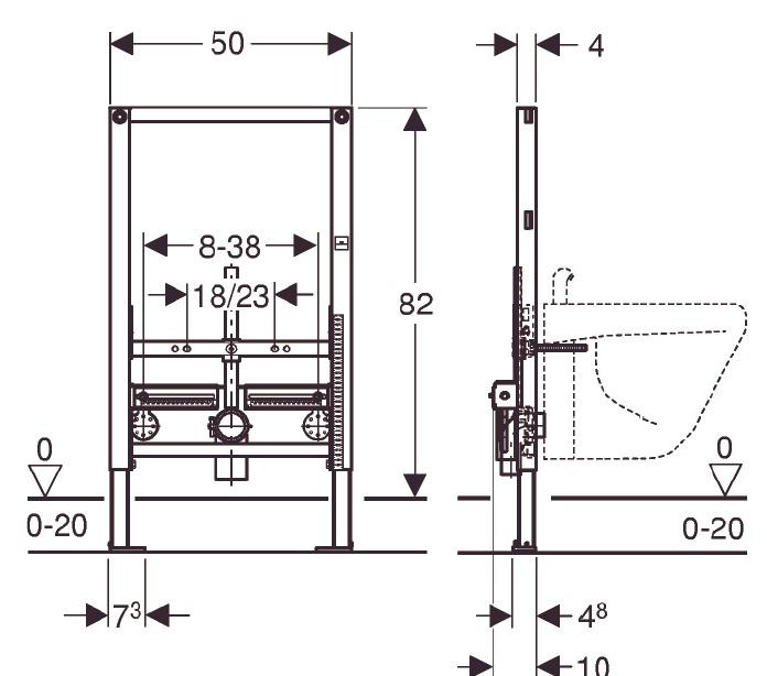 Geberit Duofix bidetelement - lav model. Duofix installationselement for bidet. Med komplet befæstigelsesmateriel. Med 2 stk. M12 bolte for montage af bidet, bolteafstand 18 eller 23 cm. Med dybdeindstillelig plade for armaturtilslutning, passende til koblingsdåse for rør i rørsystemer, inkl. Ø50 mm afløbsbøjning og gummimanchet.