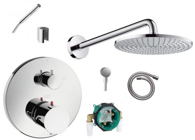 Super flot og tidsløst brusesystem fra Hansgrohe. Alt passer sammen og er klar til montering. Vi kan ikke garantere du bliver glad for det, men det er tæt på! Består af: - Axor Starck termostatarmatur med afspærring og omskifter - Ibox universal (indbygningsdel) m/lækagesikringer - Axor Starck slangeudtag - Axor Starck håndbruser (med normalestråle og Rubit rengøringsfunktion) - Axor Starck bruseslange 1,25mtr (med rengøringsvenlig glat overflade) - Axor Starck bruseholder (parkeringsplads) - Raindance Air hovedbruser Ø240mm (inkl. brusebøjning = L: 380mm) Rainair brusestråle (med kugleled, Rubit rengøringsfunktion og inkl. stabilitetsroset) Gennemstrømning ved 3 bars vandtryk: 18 l/min.  |