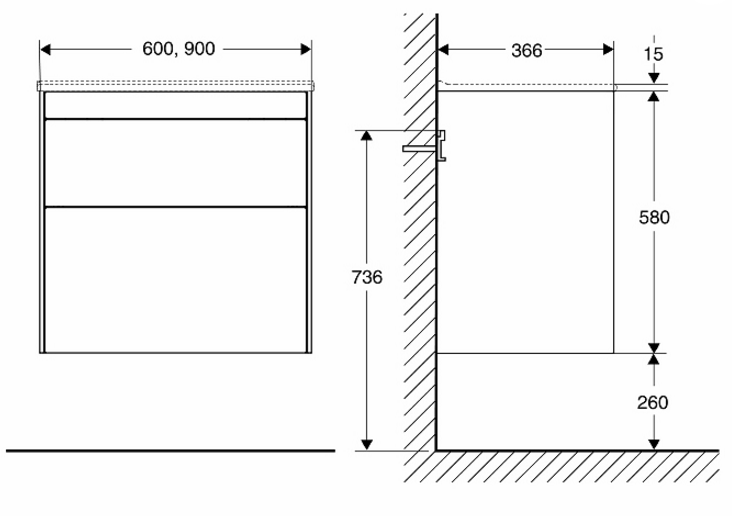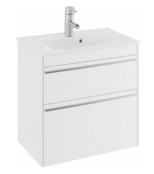 Komplet møbelpakke med smallere underskab, hvid. To softclose lukkende skuffer og Ifö Sense håndvask. Inklusiv hylde, forberedt for VVS-installation uden extra udskæring. Lige greb i aluminium indgår. Indretningspakke, vandlås og justerbare ophængningsbeslag indgår. Håndvasken har god afstillingsplads og forhøjet bagkant. Blandingsbatteri indgår ikke. Mått: H: 595 B: 600 D: 366  |