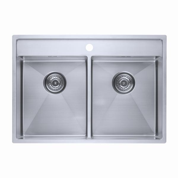 Rustfri stålvask med 2 kummer i moderne firkantet design. Med hanehul. De indvendige runde hjørner følger vaskens yderkant, hvilket giver et harmonisk design, ligeledes er de indvendige runde hjørner rengøringsvenlige.