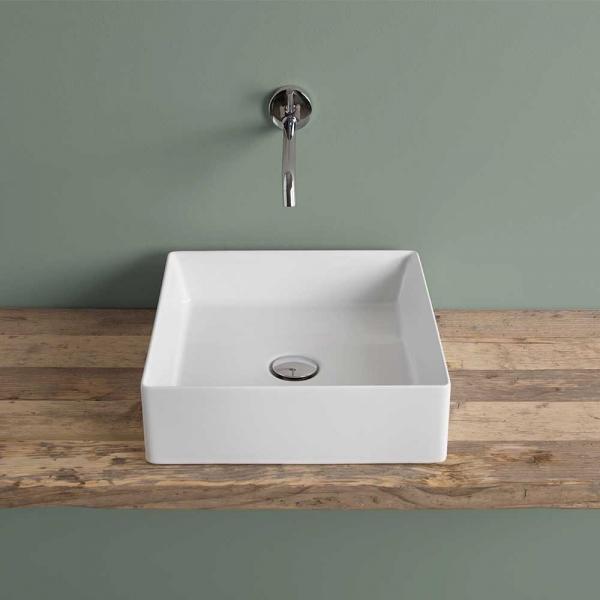Porcelænsvask i kvadratisk design, uden hanehul og overløb. Specifikationer: