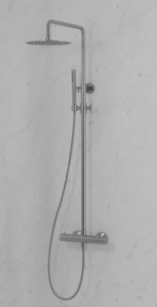 Brusesæt i rustfrit stål. Brusearmatur med integreret omskifter. Slange med antitwist. To funktioner: loftbruser og håndbruser. Sæbehylde er ekstraudstyr. |