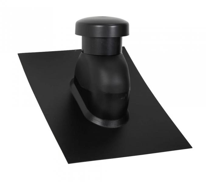 Universal ventilationshætte Ø125 sort til pap. Inkl. ABS Inddækning, plus et ekstra lag af tagpap ovenpå selve inddækning.