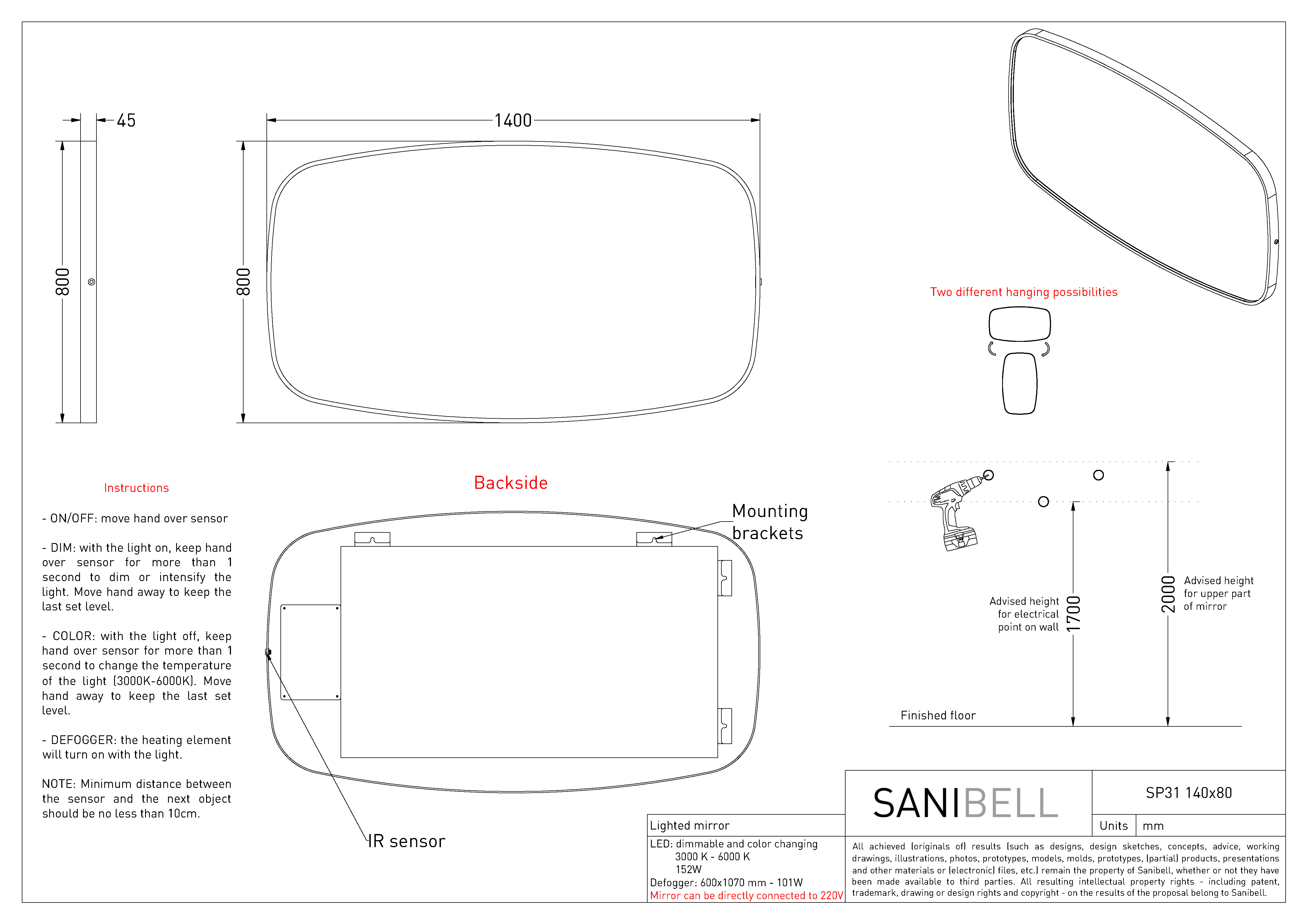 Sanibell Ink SP31 spejl m/lys, varme og sensor 140 x 80 cm - Børstet kobber