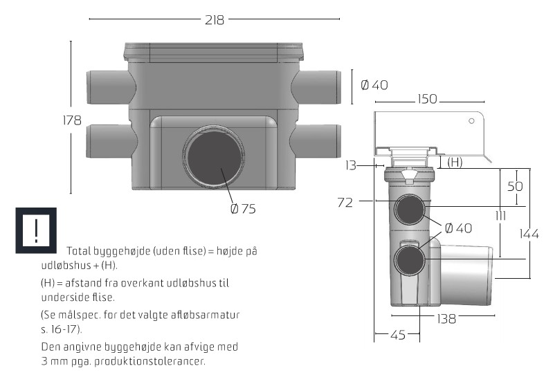 Unidrain Udløbshus 75mm Vandret m/Vandlås & Dobbelt Sideindløb Inkl optagelig vandlås med to muligheder- - Placer vandlåsen i toppen så den kun bruges af gulvafløbet - Skub vandlåsen ned i udløbshuset. så den også kan bruges til de to øverste sideindløb De to nederste indløb kræver seperat vandlås Kan vendes 180° ved behov for bagudrettet udløb 4 styk ø 40 mm sideindløb, åbnes efter behov  |