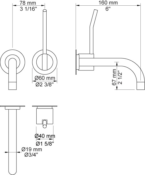 Vola Et-grebsblander med keramisk ventilenhed og fast afgangsmuffe Fast udløb, 160 mm, ø19 mm Langt 100 mm Rosetter Krom 16 ½''RG/PEX  |