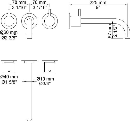 Vola 1521 to-grebsblander med keramiske ventiler 1500, 2 greb NR17, 225 mm fast tud med vandbesparende luftindblander 020, 3 stk. 60 mm dækroset 001.