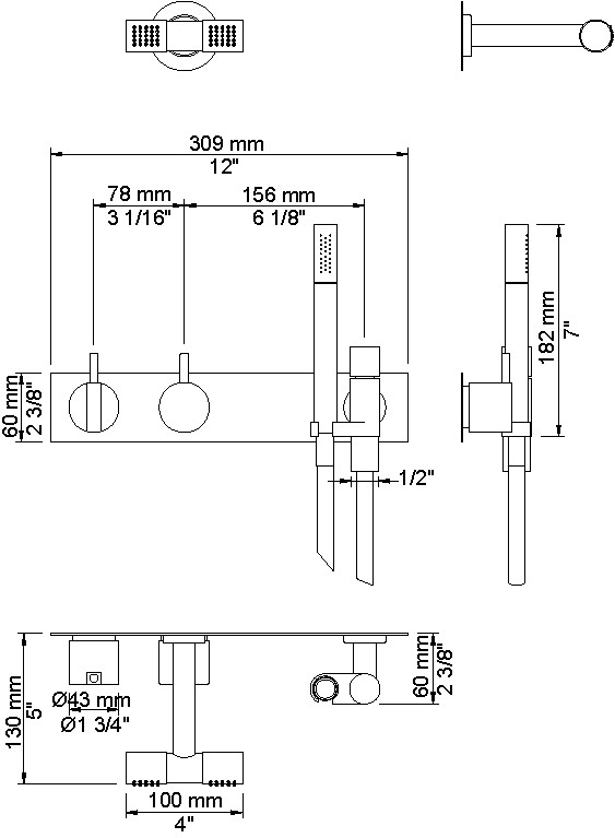 Vola 2473-081D-00 brusearmatur med keramisk ventilenhed 2400F, greb NR21, omskiftergreb NR24G, håndbruser og holder for håndbruser med kontraventil 070, tre-hulsplade 60 x 309 mm 2003, 60 mm dækroset 001.