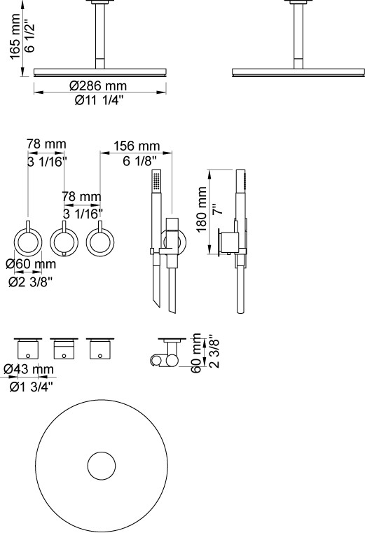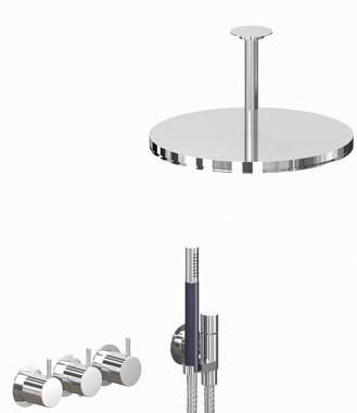 Vola ¾" termostatblander 5400F, greb NR51, termostatgreb NR52, omskiftergreb NR54G, håndbruser og holder for håndbruser med kontraventil 070, loftmonteret hovedbruser 060A, 3 stk. 60 mm dækroset 2001,