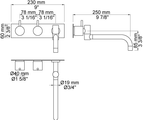 To-grebsblander med keramiske ventiler 600, 2 greb NR17, 250 mm dobbelt svingbar tud 030Tre-hulsplade 60 X 230 mm 003K. Kan også anvendes som køkkenarmatur.  |