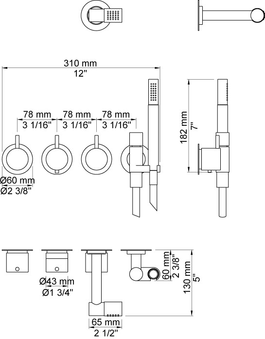 Vola Indbygningstermostat ¾'' med omskifter T2 håndbruser med metalslange og holder til højre Hovedbruser, 115 mm Separat udløb Rosetter Krom 16 3/4''RG/PEX