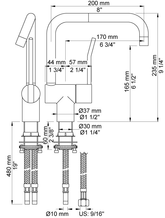 Et-grebsblander med langt greb og keramiske ventilenhed, 360° dobbelt svingbar tud. Vandbesparende luftindblander.